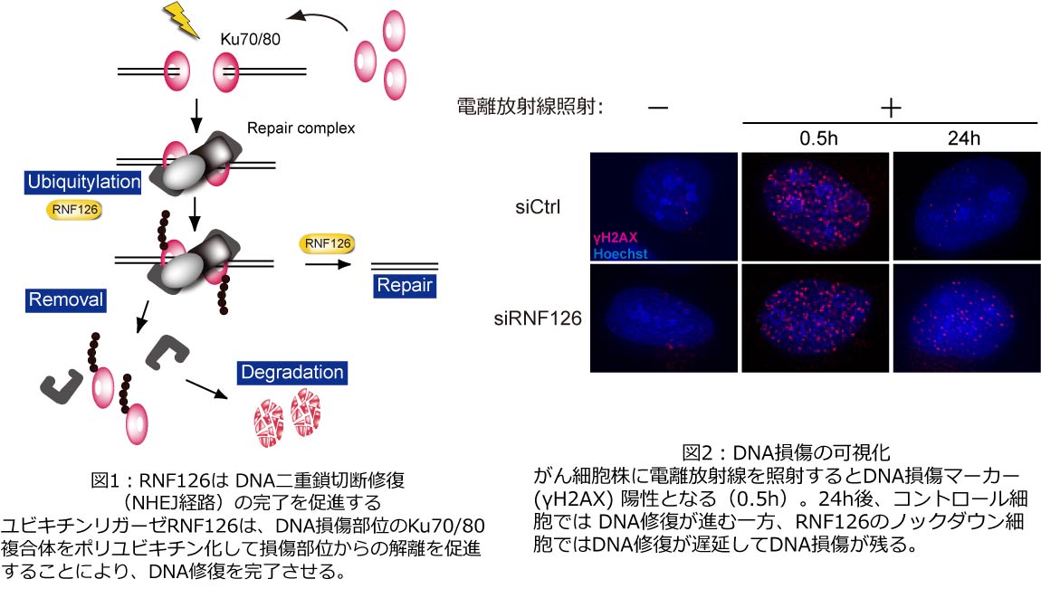 ユビキチンを標的タンパク質に特異的に付加する、重要な役割を担うのが「ユビキチンリガーゼ」と呼ばれる酵素群です。私たちはユビキチンリガーゼRNF126がDNA二重鎖切断修復のNHEJ(非相同末端結合)経路の完了に必要であることを発見、報告しました。さらにがんの増殖や分化における役割を明らかにするために研究を進めています。