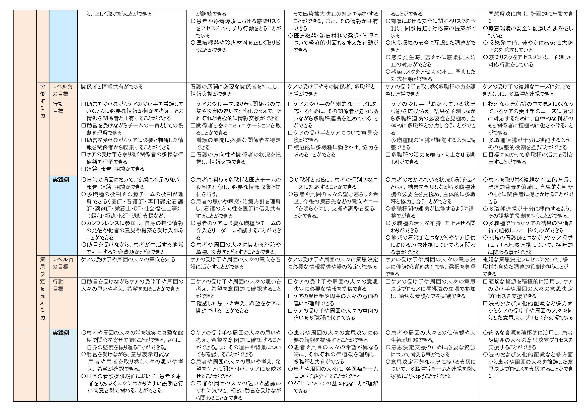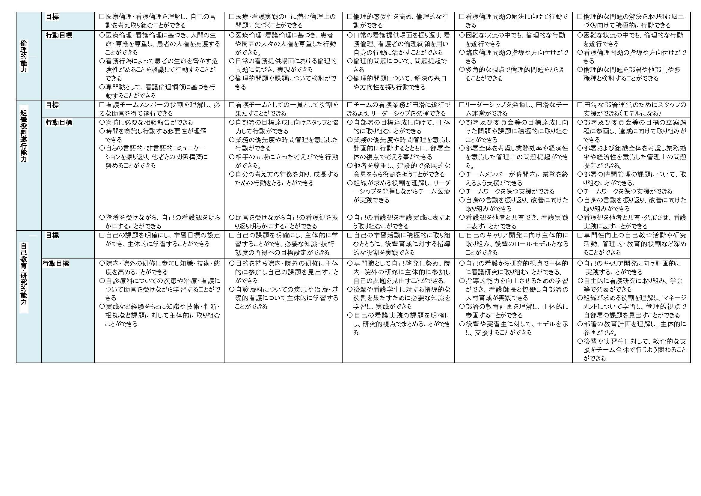 看護の核となる実践能力、倫理的能力、組織役割遂行能力、自己教育・研究的能力の4つの領域としました。